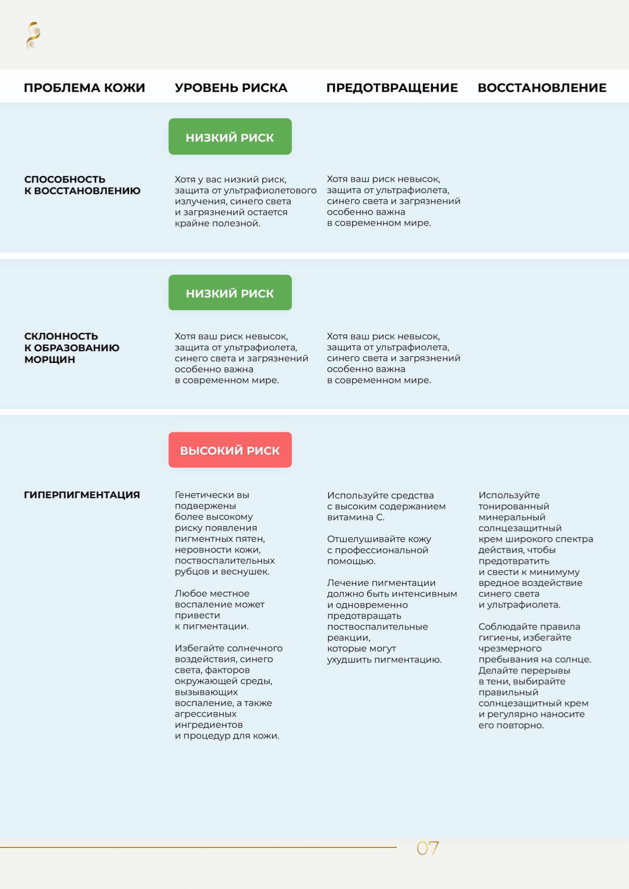 Индивидуальный генетический профиль красоты — это понятный отчет с графиками и диаграммой «Ваша стратегия по уходу за кожей», где наглядно показаны зоны высокого, среднего и низкого генетического риска. Используйте эти данные, чтобы адаптировать свой ежедневный уход и сосредоточиться на том, что действительно важно.